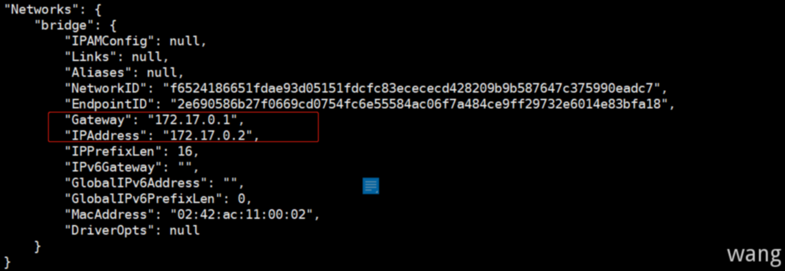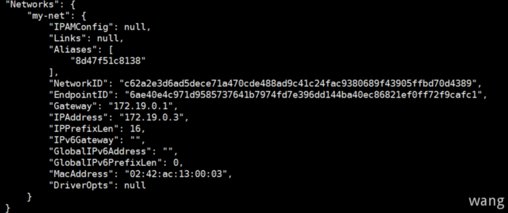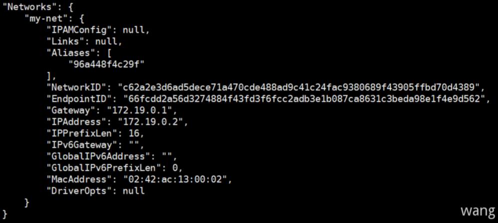 fa66bc1a17f4 none null local看到新增网桥 br-c62a2e3d6ad5, c62a2e3d6ad5 是新建网桥 my-net 的短id,docker network inspect 看下 my-net 的配置信息: