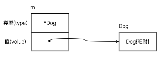 m.Move() // panic: runtime error: invalid memory address or nil pointer dereference接下来将一个*Dog结构体指针赋值给变量m,此时m的动态类型会被设置为*Dog,动态值为结构体变量的拷贝。