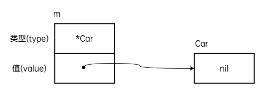 然后给接口变量m赋值为一个*Car类型的值。此时接口值的动态类型为*Car,动态值为nil。