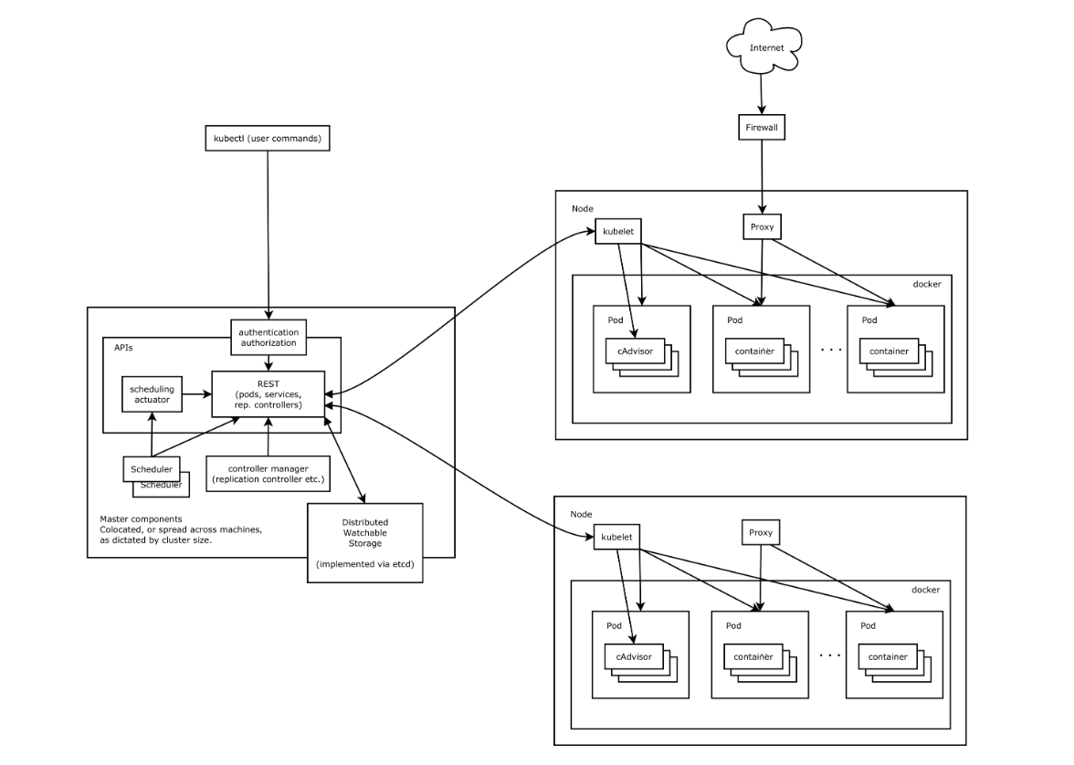 Kubernetes 借鉴了 Borg 的设计理念,比如Pod、Service、Labels等。整体架构跟 Borg 非常像,如下图所示: