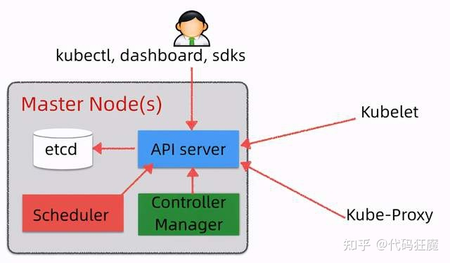 - Api Server:集群统一入口,以 restful 风格操作,同时交给 etcd 存储(是唯一能访问etcd的组件)提供认证、授权、访问控制、API注册和发现等机制,可以通过 kubectl 命令行工具,dashboard 可视化面板,或者sdk 等方式访问