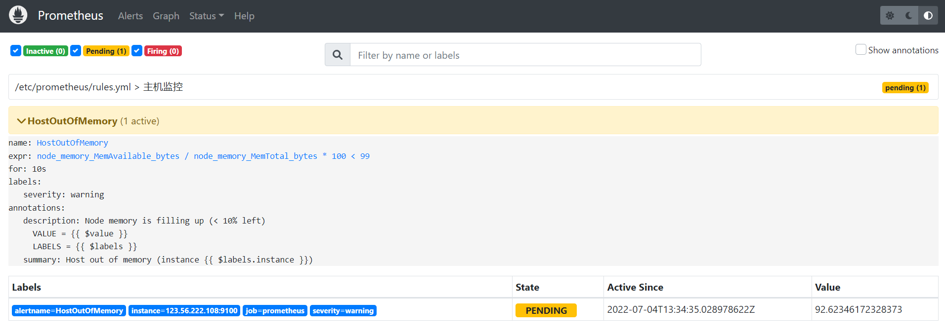 docker run -d --name prometheus -p 9090:9090 -v /etc/prometheus/prometheus.yml:/etc/prometheus/prometheus.yml -v /etc/prometheus/rules.yml:/etc/prometheus/rules.yml prom/prometheus查看告警状态#
