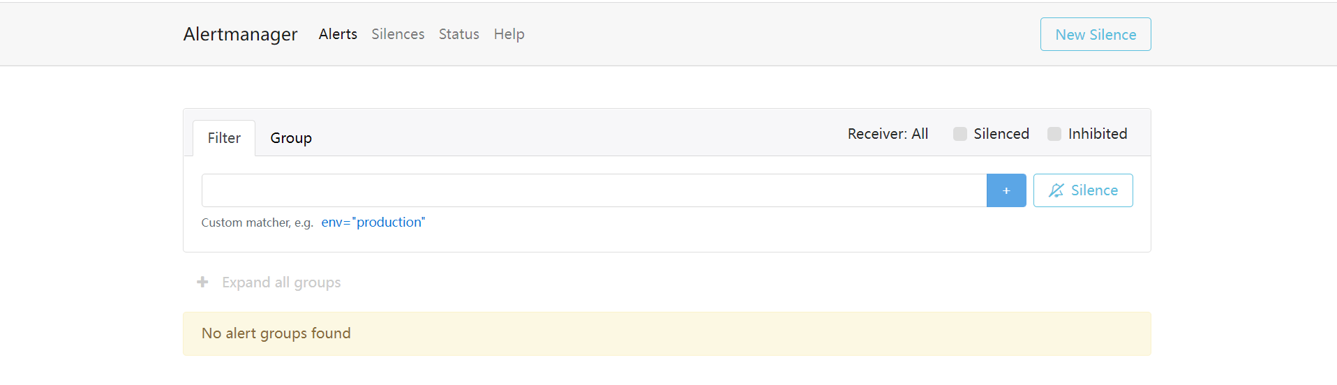 docker run -d --name alertmanager -p 9093:9093 -v /etc/alertmanager/alertmanager.yml:/etc/alertmanager/alertmanager.yml prom/alertmanager:v0.23.0访问 http://ipaddress:9093 在浏览器中查看: