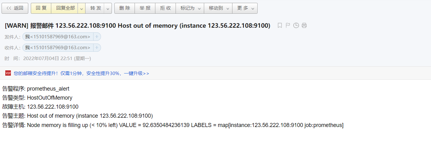 docker run -d --name alertmanager -p 9093:9093 -v /etc/alertmanager/alertmanager.yml:/etc/alertmanager/alertmanager.yml -v /etc/alertmanager/email.tmpl:/etc/alertmanager/templates/email.tmpl prom/alertmanager:v0.23.0查看邮件: