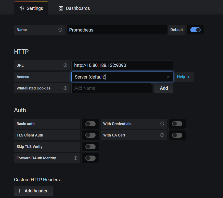 Name: 数据源名称URL: Prometheus 地址Access: Server(Default)