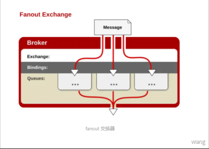 发布订阅模式(fanout),消息发送到Exchange,所有订阅了当前Exchange的Queue都可以收到消息。fanout 交换器不处理路由键,只是简单的将队列绑定到交换器上。每个发到 fanout 类型交换器的消息都会分发到所有绑定的队列上去。很像子网广播,每台子网内的主机都获得了一份复制的消息。fanout 类型转发消息是最快的