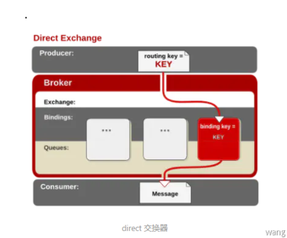 direct跟fanout的区别在于多了routekey,消息发送到Exchange,所有订阅了当前Exchange并且routingKey完全匹配的Queue才可以收到消息。消息中的路由键(routing key)如果和 Binding 中的 binding key 一致,交换器就将消息发到对应的队列中。路由键与队列名完全匹配,如果一个队列绑定到交换机要求路由键为“dog”,则只转发 routing key标记为“dog”的消息,不会转发“dog.puppy”,也不会转发“dog.guard”等等。它是完全匹配、单播的模式。