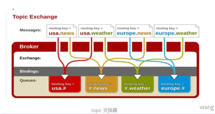 注意:RabbitMQ中通配符并不像正则中的单个字符,而是一个以“.”分割的字符串,如 ”topic1.*“匹配的规则以topic1开始并且".“后只有一段语句的路由。例:“topic1.aaa”,“topic1.bb”