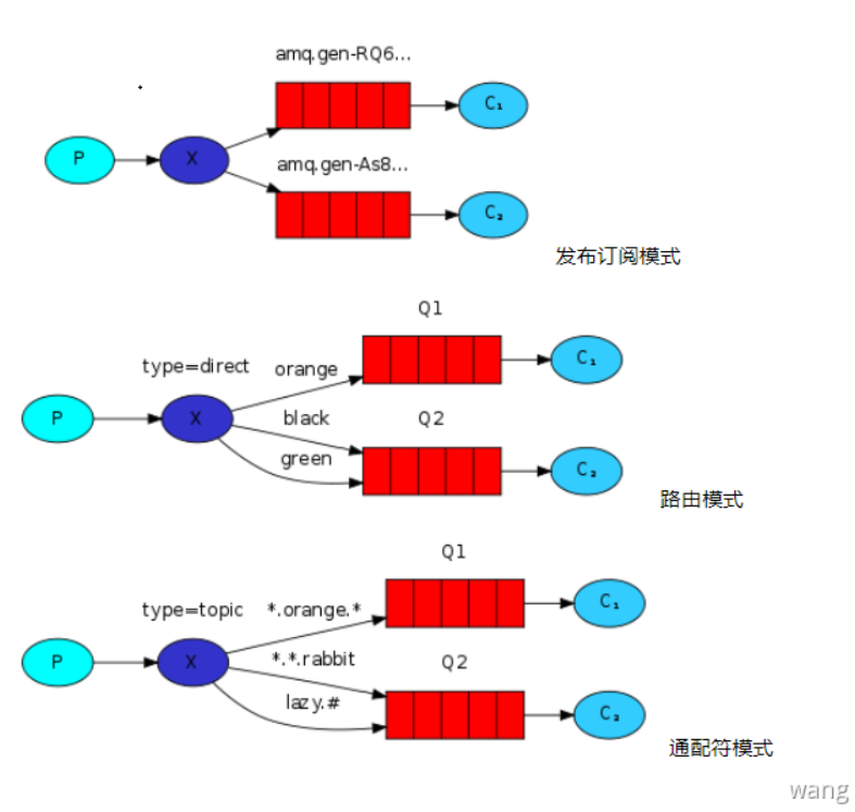 }发布,路由,通配符这三种模式可以算为一种模式,区别仅仅是交互机类型不同.发送者将消息发送发送到交换机,接收者创建各自的消息队列绑定到交换机。