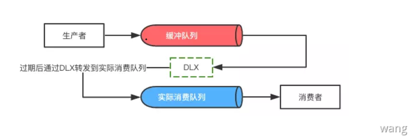 生产者产生的消息首先会进入缓冲队列(图中红色队列)。通过RabbitMQ提供的TTL扩展,这些消息会被设置过期时间,也就是延迟消费的时间。等消息过期之后,这些消息会通过配置好的DLX转发到实际消费队列(图中蓝色队列),以此达到延迟消费的效果。