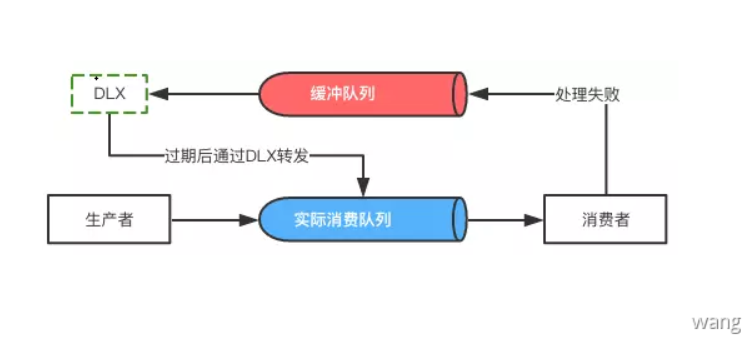 消费者发现该消息处理出现了异常,比如是因为网络波动引起的异常。那么如果不等待一段时间,直接就重试的话,很可能会导致在这期间内一直无法成功,造成一定的资源浪费。可以将其先放在缓冲队列中(图中红色队列,可以理解为重试定义的exchange),等消息经过一段的延迟时间后再次进入实际消费队列中(图中蓝色队列),此时由于已经过了“较长”的时间了,异常的一些波动通常已经恢复,这些消息可以被正常消费。
