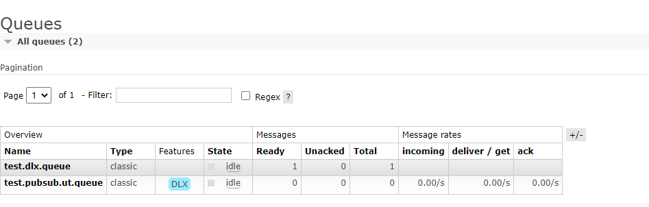 实际环境还需要对死信队列进行一个监听和处理,具体的处理逻辑和业务相关,这里只简单演示死信队列是否生效。