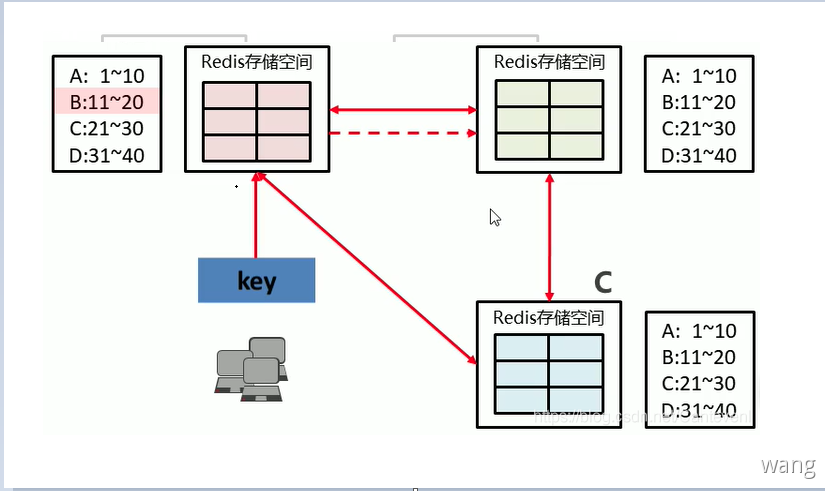 1):客户端发出一个key访问A,通过算法计算出key的存储位置